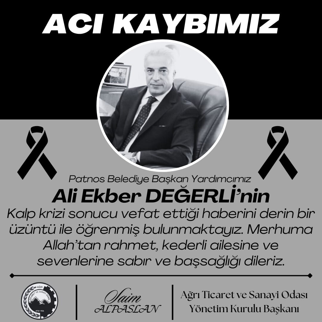 Patnos Belediye Başkan Yardımcısı Merhum Ali Ekber DEĞERLİ, Ağrı Ticaret ve Sanayi Odası Yönetim Kurulu Başkanı Saim ALPASLAN’I, vefatından kısa bir süre önce makamında ziyaret etmişti. Sonrasında kalp krizi sonucu vefat ettiği haberini derin bir üzüntü ile öğrenmiş olduk. Merhuma Allah’tan rahmet, kederli ailesine ve sevenlerine sabır ve başsağlığı dileriz.