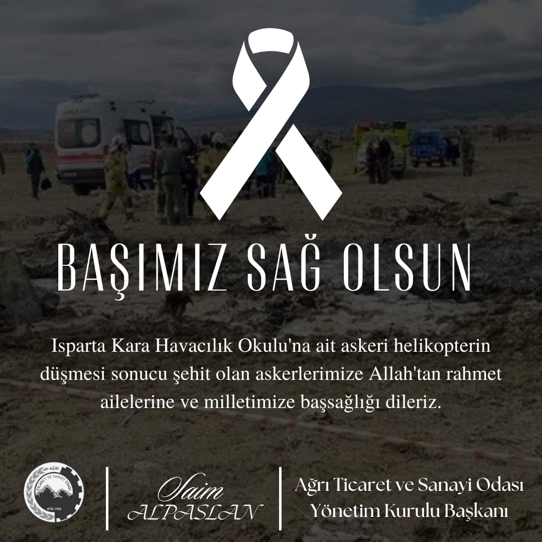 Isparta’nın Keçiborlu ilçesinde eğitim uçuşu sırasında iki askeri helikopterin teması sonucu bir askeri helikopter düştü. Diğer askeri helikopterin de güvenle indirildiği açıklandı. Ağrı Ticaret ve Sanayi Odası Yönetim Kurulu Başkanı Saim ALPASLAN; elim kazada şehit olan askerlerimize Allah’tan rahmet, ailelerine ve milletimize baş sağlığı diledi.